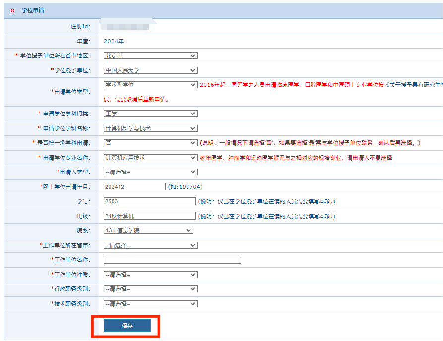保存学位申请信息后,请在本页面顶端【已申报学科信息】位置点击提交申请。