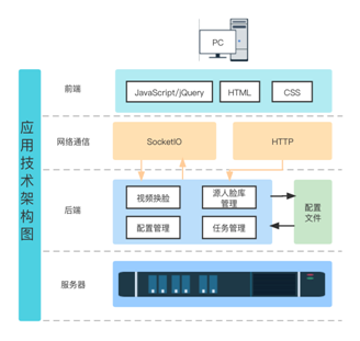 我们的系统基于B/S框架。如图2所示,系统包括了视频换脸、源人脸库管理、配置管理和视频转换任务管理四大模块。用户端网页可通过调用摄像头采集视频,将视频流发送给后端服务器的视频换脸模块,处理完成后再分发给用户和所有的在线观众端。