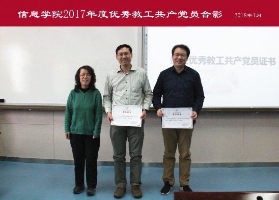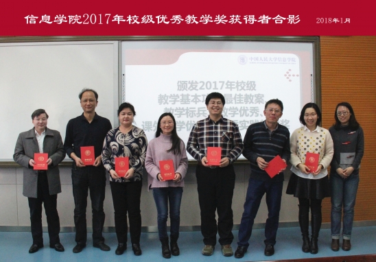 陈红书记介绍2017年度学院教学、科研、社会服务及管理服务先进工作者,2017年度优秀教工共产党员,2016-2017学年校级优秀班主任,2017年度教学基本功、教学标兵、教学优秀、优秀实践教学奖获得者,2017年先进集体。文继荣院长、陈红书记、副院长李翠平教授、左美云教授、柯媛元教授为各位获奖教师颁奖。