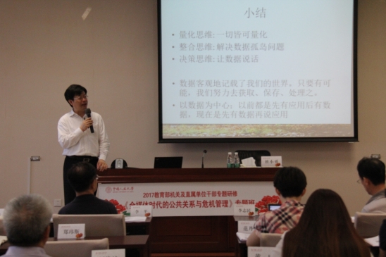 4月17日至21日及6月19日至23日,教育部机关及直属单位干部专题研修“互联网、大数据的发展对社会治理的影响”、“全媒体时代的公共关系与危机管理”专题班顺利开班,共计300余名干部参加学习。威尼斯官网杜小勇教授、文继荣教授、石文昌教授等围绕“互联网与大数据”讲授相关专题课程。