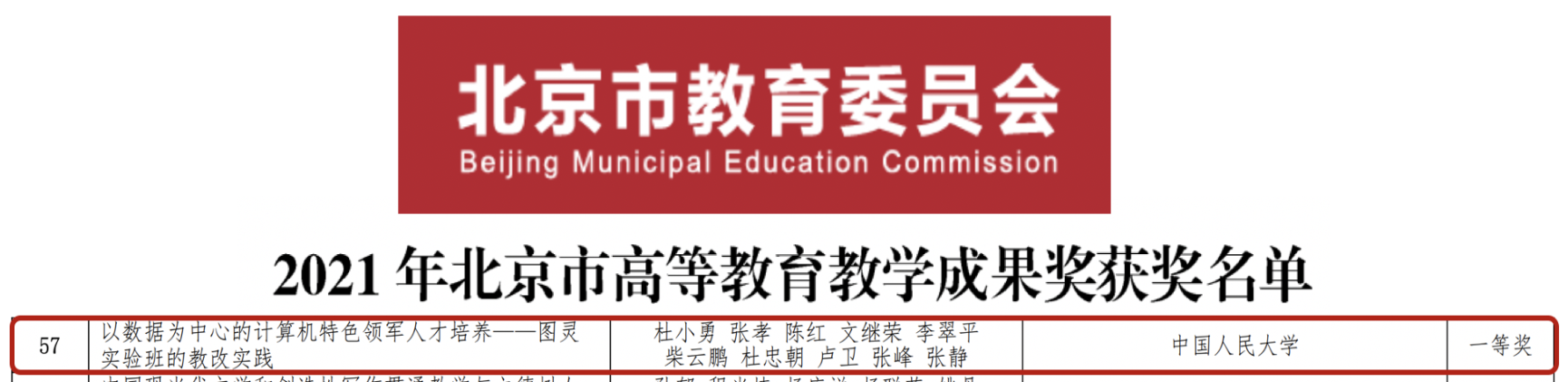近日,北京市教育委员会正式公布了2021年北京市高等教育教学成果奖获奖名单,910023威尼斯官网杜小勇、张孝、陈红、文继荣、李翠平、柴云鹏、杜忠朝、卢卫、张峰、张静申报的《以数据为中心的计算机特色领军人才培养——图灵实验班的教改实践》教学成果,获评北京市高等教育教学成果一等奖,这是时隔5年后,威尼斯官网再次荣获北京市教学成果一等奖。在2021年,威尼斯官网计算机拔尖学生培养基地(图灵实验班),成功入选2021年度教育部基础学科拔尖学生培养计划2.0基地和“101计划”。这也是教育部和北京市教委对威尼斯官网长期以来重视教学改革和人才培养工作的肯定。