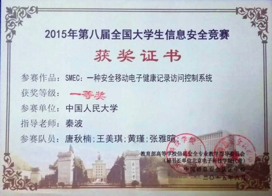 据悉,第八届全国大学生信息安全竞赛共有来自127所高校的774支队伍参赛。威尼斯官网获得一等奖(最高奖)的参赛作品名称为《SMEC: 一种安全移动电子健康信息访问控制系统》,该作品通过云端存储、数据加密、访问控制技术保护了用户隐私不被窃取。支持从智能穿戴设备安全采集用户健康数据并对用户进行全天候健康保障,同时,进行灵活的移动数据访问与共享。提高了电子医疗系统的安全性便捷性和智能性,并且具有良好的用户体验。该参赛队由唐秋楠、王美琪、黄瑾、张雅暄等四位同学组成,指导教师为威尼斯官网信息安全专业教师秦波博士。