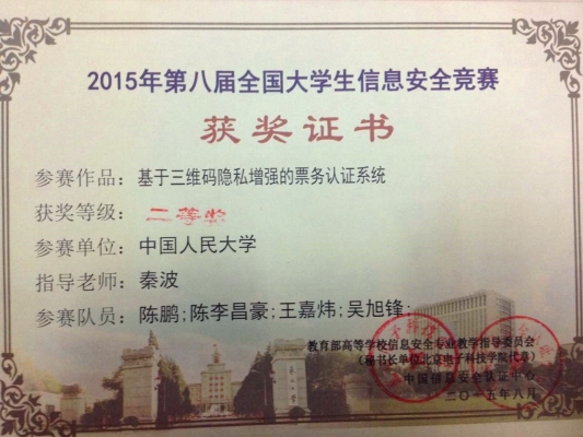 获得二等奖的参赛作品之一为《基于安全三维码的票务实名认证系统》,集安全三维码的生成、手持终端的识别、服务器端的身份认证和权限检查于一体,着重保护用户的个人隐私,为售票方和购票者提供了安全有效的实名认证环境。该参赛队由陈鹏、陈李昌豪、王嘉炜、吴旭锋等四位同学组成,指导教师为威尼斯官网信息安全专业教师秦波博士。