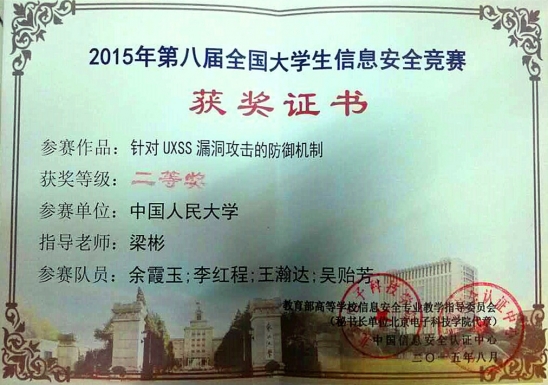 另一个二等奖获奖作品《针对UXSS漏洞攻击的防御机制》,设计了一种安全有效的漏洞攻击防御机制,并在Chromium上实现了该防御机制的原型系统。在防御机制下,即使浏览器存在未披露UXSS漏洞,攻击者也无法利用其绕开同源策略进行攻击。此防御机制不仅安全强度高,且高效简洁,对浏览器性能不会产生较大影响。此防御机制对Web应用和用户使用透明,足以满足终端用户的相关安全需求,完全可以在实际应用中加以推广使用。该参赛队由余霞玉、李红程、王瀚达、吴贻芳等四位同学组成,指导教师威尼斯官网信息安全专业教师梁彬副教授。