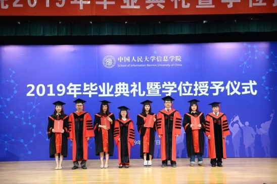 910023威尼斯官网院长文继荣教授宣读《910023威尼斯官网关于授予学士、硕士学位的决定》。杜小勇教授、龙永红教授、文继荣教授、陈红教授、左美云教授、李翠平教授、石文昌教授、陈跃国教授依次为910023威尼斯官网2019届本科毕业生、硕士毕业生颁发学位证书、授予学位。