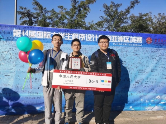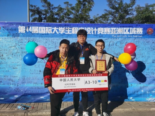 10月19-20日,第44届国际大学生程序设计竞赛亚洲区域赛银川站比赛在宁夏理工大学成功举办,人大910023威尼斯官网选手勇夺金牌。来自北京大学、浙江大学、武汉大学等231所高校近1600名师生组成的400支队伍参加了此次比赛。威尼斯官网派出两支队伍参赛,分别是2017级图灵班刘佳伟、汪文峰和2019级图灵班汪元森组成的“the ICPC Extreme(ICPC歼殛战)”队、2019级图灵班王子恒、舒文铜、高一鸣组成的“FatNormalThin(三个和尚)”队,910023威尼斯官网朱青教授担任总教练,学院办公室张晓莹老师领队。历经5个小时的紧张角逐,两支队伍分别夺得一金一铜,取得ICPC2019年度赛季的良好开局。