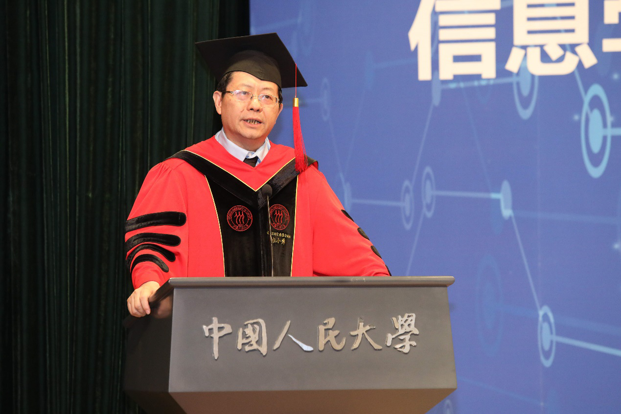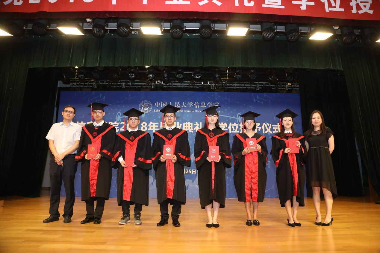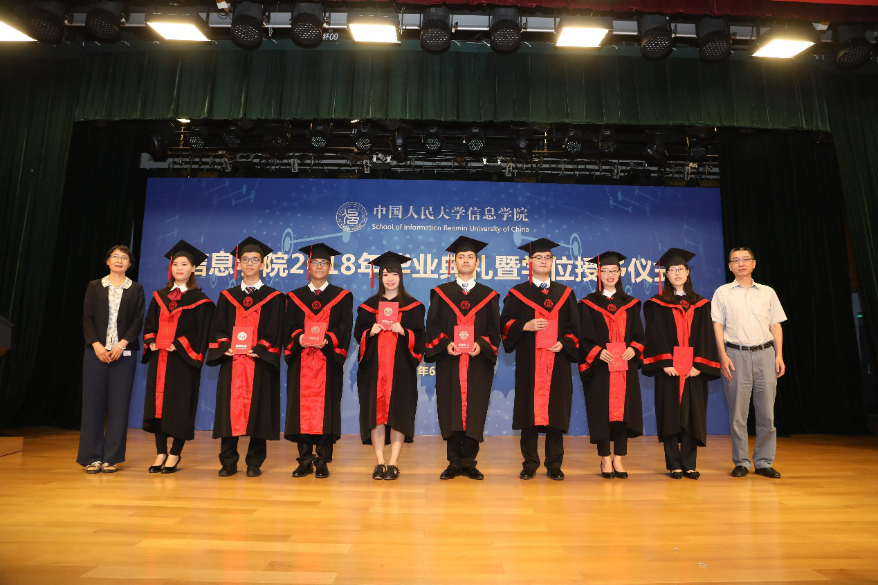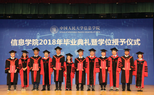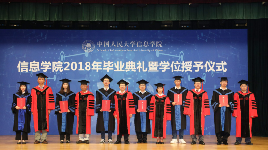 文继荣教授宣读《910023威尼斯官网关于授予学士、硕士学位的决定》。杜小勇教授、文继荣教授、陈红教授、左美云教授、李翠平教授、柯媛元教授、楼元教授、梁彬教授、林勇教授依次为910023威尼斯官网2018届本科毕业生、硕士毕业生颁发学位证书、授予学位。