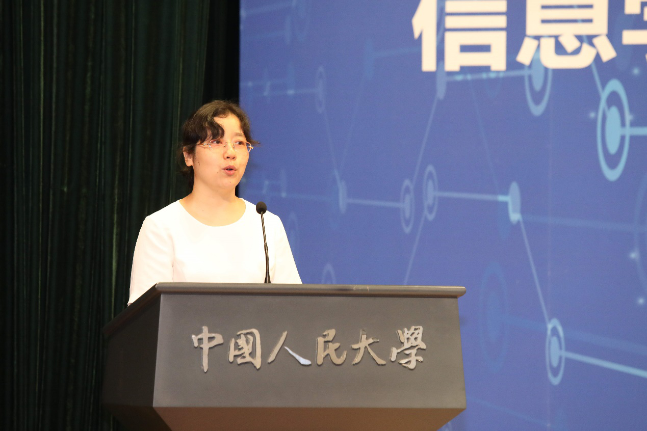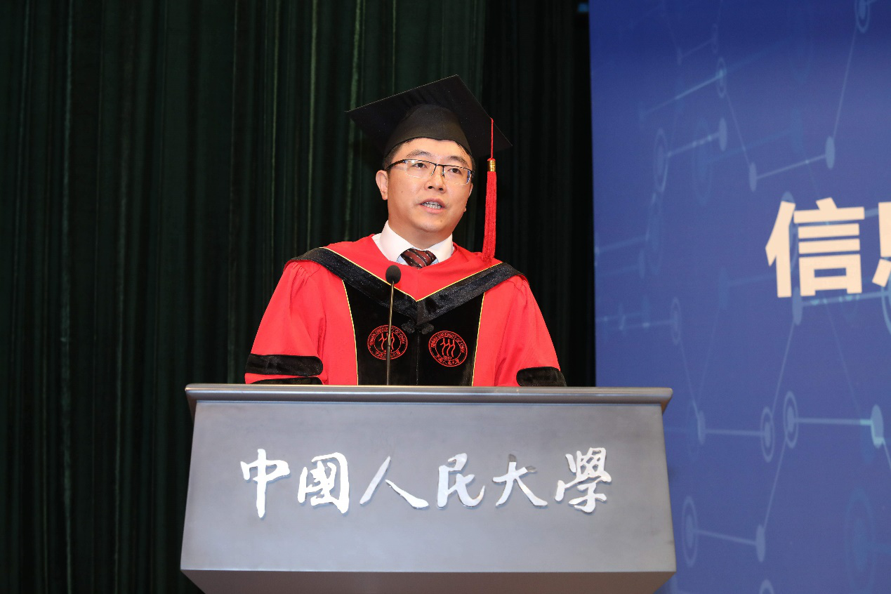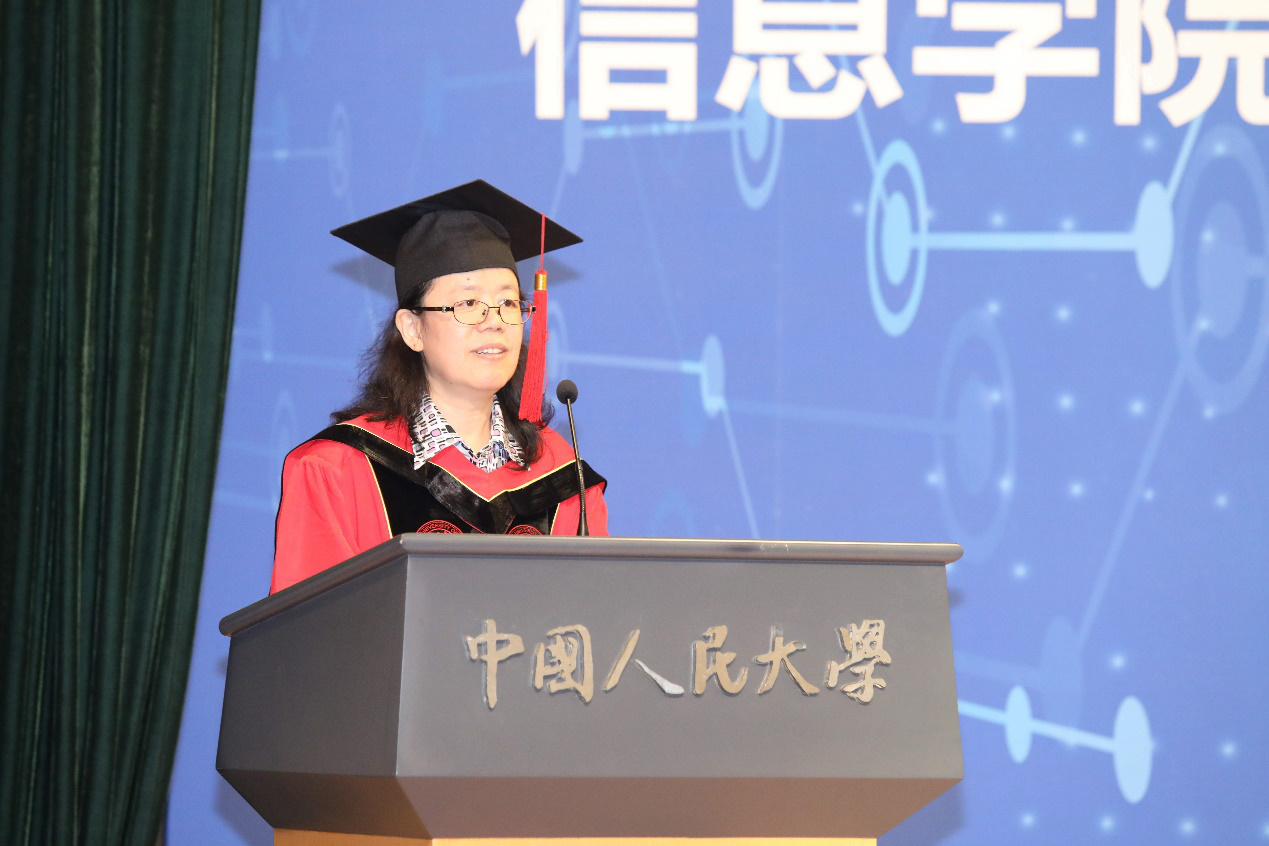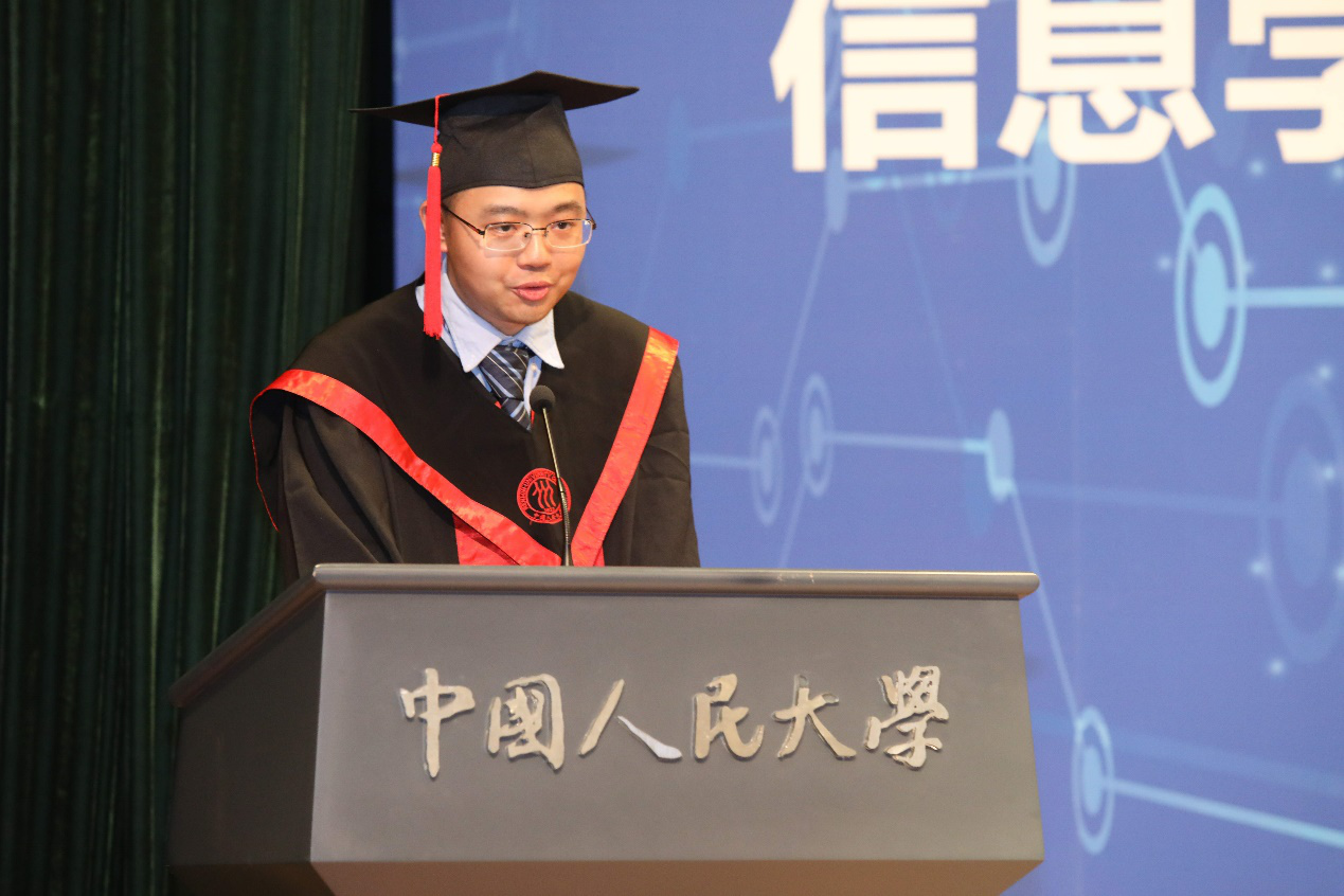 文继荣教授宣读《910023威尼斯官网关于授予学士、硕士学位的决定》。杜小勇教授、文继荣教授、陈红教授、左美云教授、李翠平教授、柯媛元教授、楼元教授、梁彬教授、林勇教授依次为910023威尼斯官网2018届本科毕业生、硕士毕业生颁发学位证书、授予学位。