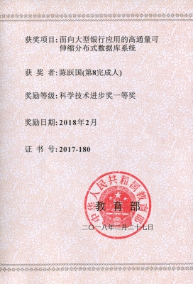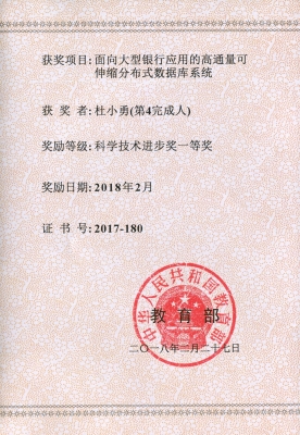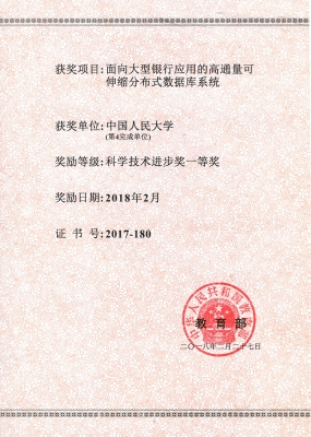 近日,教育部公布了《关于2017年度高等学校科学研究优秀成果奖(科学技术)奖励的决定》,授予“面向大型银行应用的高通量可伸缩分布式数据库系统”项目高等学校科学研究优秀成果奖科学技术进步奖一等奖。该项目自2015年起,由华东师范大学,西北工业大学,交通银行股份有限公司联合威尼斯官网共同完成,威尼斯官网为第四完成单位。这是继2017年,威尼斯官网作为第一完成单位获得教育部科技进步一等奖后,再次以联合单位获得该类奖项。