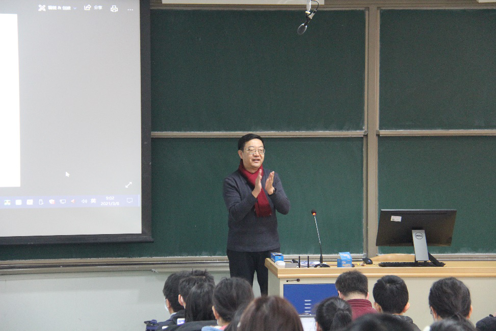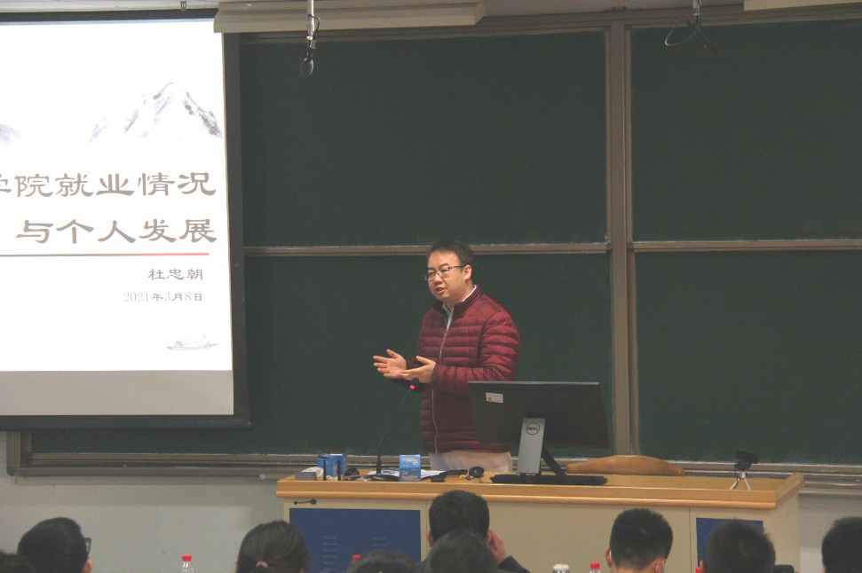 910023威尼斯官网党委副书记杜忠朝从学生比较关心的就业、保研方面向同学们做了介绍。杜忠朝老师向同学们展示了近几年学院的保研和就业方向数据,让同学们不用过于担心毕业后的去向问题。同时,杜忠朝老师还向同学们介绍了“本科生进实验室”活动,鼓励同学们在本科尽早开始做科研。