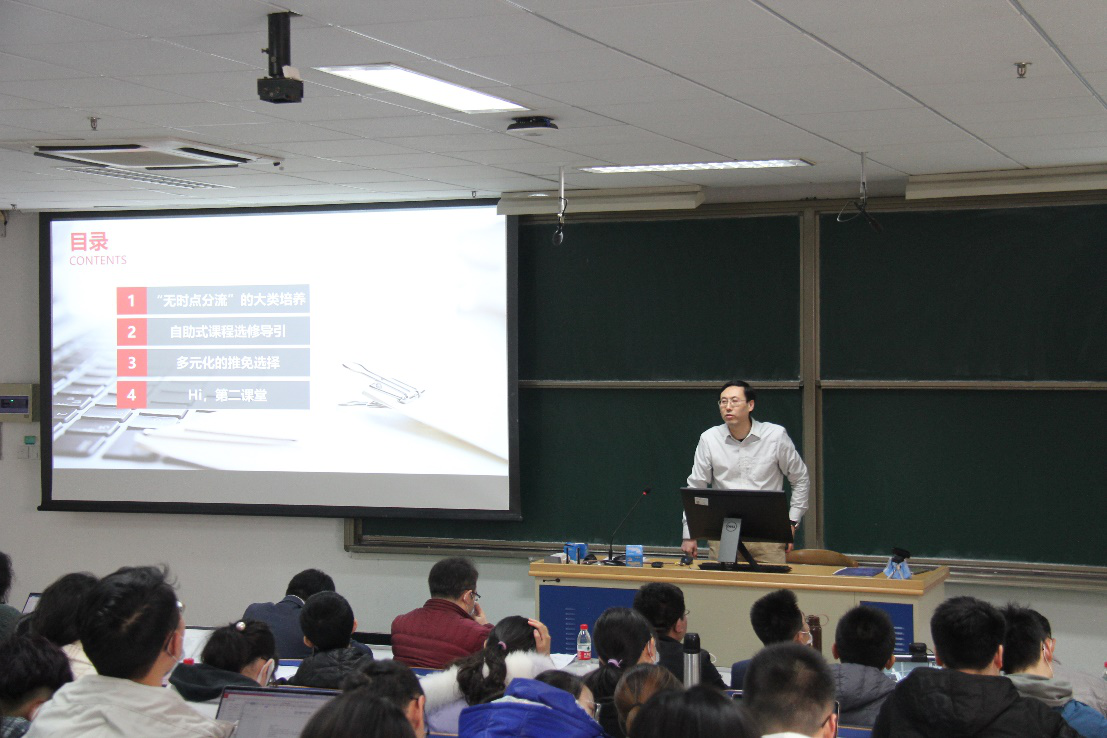 910023威尼斯官网副院长张孝就学院的人才培养方面向同学们进行了宣讲。张孝老师通过“无时点分流”的大类培养,自助式课程选修,多元化的推免选择,以及第二课堂——丰富多彩的竞赛活动四个方面全方位的向同学们介绍了910023威尼斯官网人才培养的多元性和全面性。
