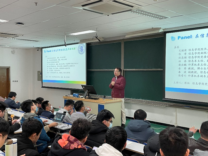 之后,910023威尼斯官网本科各专业负责老师依次上台,向明理书院的学生们宣讲了学院各专业的历史背景、课程设置、人才培养计划和研究方向等具体内容。柴云鹏老师介绍了计算机及软件工程专业;许伟老师介绍了信息管理与信息系统专业;秦波老师负责信息安全专业的介绍;陈晋川老师则负责数据科学与大数据技术专业的介绍。