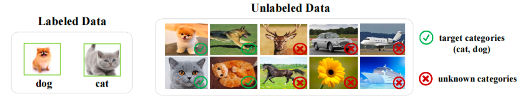 当前,传统的主动学习方法基于一个共同的假设:标记与未标记数据均来自相同的类别分布。然而,这一假设在实际应用中并不成立。例如,当从互联网上利用关键字“猫”和“狗”(目标类别)抓取图像时,可能会收集到大量不属于目标类别的图像,如“鹿”、“马”、“飞机”、“船”、“汽车”和“花”(未知类别)等等。本文主要针对这种“类别分布不匹配”场景,即未标记数据中含有标记数据的类别分布之外的样本,展开主动学习的拓展研究。