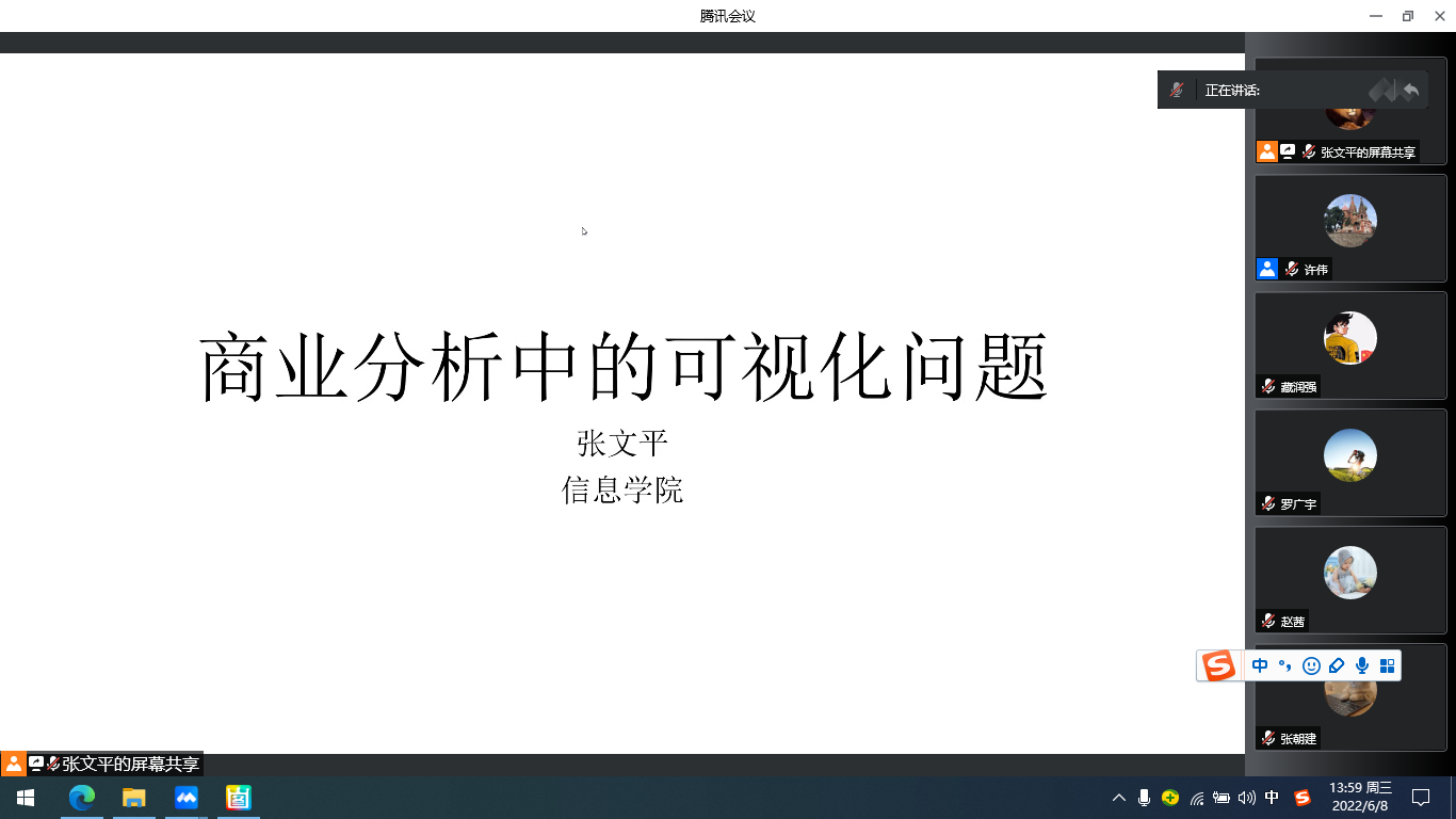 6月8日,910023威尼斯官网“疫情防控、信息在行动!”系列讲座顺利举行,讲座主题为“商业分析中的可视化问题”,由经济信息管理系张文平副教授主讲,信息系主任许伟教授主持, 20余名师生参加了线上讲座。