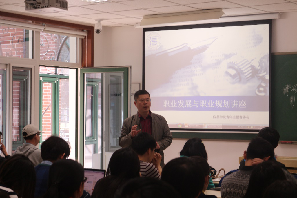 王宇根据自己在金融行业打拼的经历,结合PPT从银行、证券、保险、资产管理、信托等方面为同学们讲解金融行业主流从业方向和特点。关于就职王宇师兄提出 “根据你以后想要过那种生活,自己有哪些特长和喜好,量身为自己选择就职方向”的观点,并与现场的同学进行问答互动。