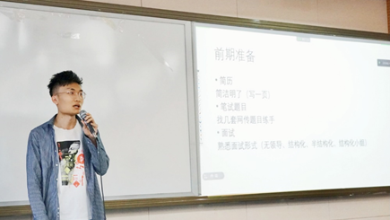 雷东荧结合自身找工作的心路历程、简历投递、笔试经验等为同学们分享了求职经验。提醒同学们要心中有数,提前准备,做好应聘时间表;对于简历的编辑上要梳理经历,提炼成果;对于笔试上要注重行测是基础但专业知识不能落下;对于面试上要提前准备,以不变应万变。