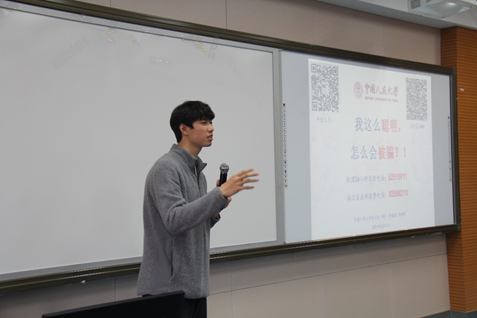 之后的反电信诈骗宣讲中,李佩恒从当前大学生对于“电信诈骗”的薄弱防范意识为切入点,以诙谐幽默的方式讲述了电信诈骗的一些常见手段和发生在校园内的真实案例。李佩恒强调,骗子主要依靠受害人的紧张情绪来骗取钱财,并介绍了一些常用的电诈套路,如:“冒充熟人借钱”、“冒充公检法执法人员”、“冒充金融机构”、“冒充老师上司”等。所以在遭遇这类情况时,一定要稳定情绪,不要过于激动。