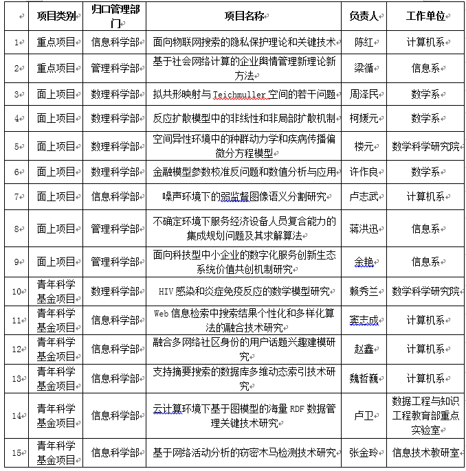 近日,国家自然科学基金委员会公布了2015年度集中受理项目的评审结果,910023威尼斯官网获得4项重点项目,其中管理科学部3项,信息科学部1项,创历史新高,其中910023威尼斯官网获得2项。在今年已经公布的项目中,910023威尼斯官网共获得52项资助,其中910023威尼斯官网(含教育部数据工程与知识工程重点实验室、数学科学研究院)获得15项,位居全校首位。