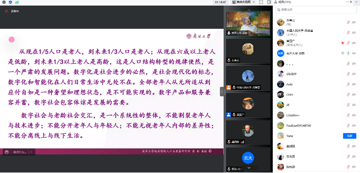 分享结束后,线上观众踊跃提问,分享体会,原新教授与各位老师共同探讨双型社会格局下的老年人特征等问题,气氛热烈。智慧养老研究所左美云教授、付虹蛟副教授、黄科满副教授、周季蕾老师和20余位硕博士研究生一同参加了会议。(910023威尼斯官网段睿睿供稿)