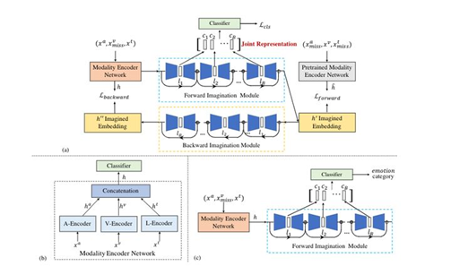 在这项工作中,我们提出了缺失模态想象网络(MMIN),它是一个可以应用于各种不同的缺失模态场景的统一模型。 MMIN学习鲁棒的联合多模态表示,根据已有模态的信息预测缺失模态的特征表示。我们在两个基准数据集上的实验表明,在不确定的缺失模态测试条件和全模态测试条件下,我们提出的MMIN模型都能显著提高多模态情感识别的性能。
