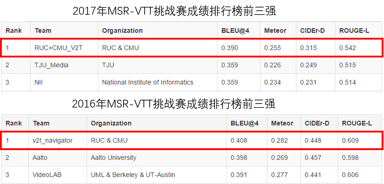 金琴副教授与卡内基梅隆大学 Alexander Hauptmann教授合作的团队在第一届MSR-VTT挑战赛中获得自动评测第一,人工评测第二,在今年举办的第二届MSR-VTT挑战中,进一步在自动评测和人工评测上均取得了第一的佳绩! RUC+CMU_V2T团队成员: 金琴、陈师哲、熊一帆、陈佳、Alex Hauptmann。