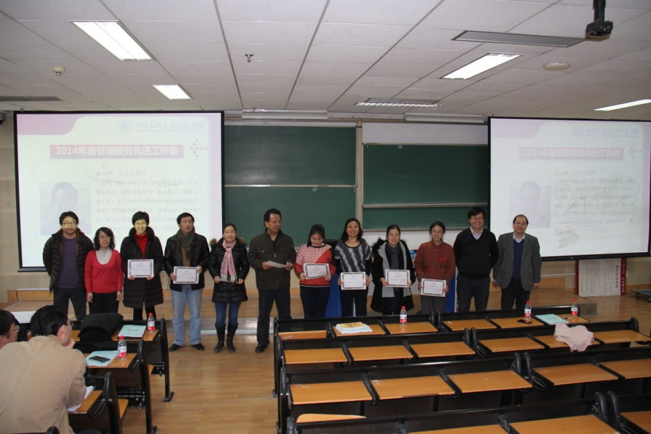 接下来,学院党委书记陈红主持了二级教代会,并揭晓了910023威尼斯官网2014年度先进工作者名单,杜小勇院长、陈红书记、左美云副院长、文继荣副院长纷纷为先进工作者颁发证书,先进工作者张新勇老师做代表发言。