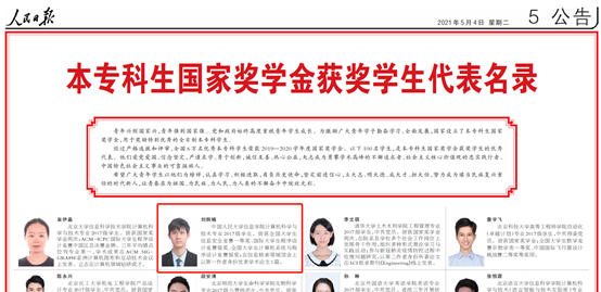 2021年5月4日版的《人民日报》刊登了国家奖学金获奖学生优秀代表的事迹,910023威尼斯官网刘炯楠同学作为优秀学生代表登上了《人民日报》。