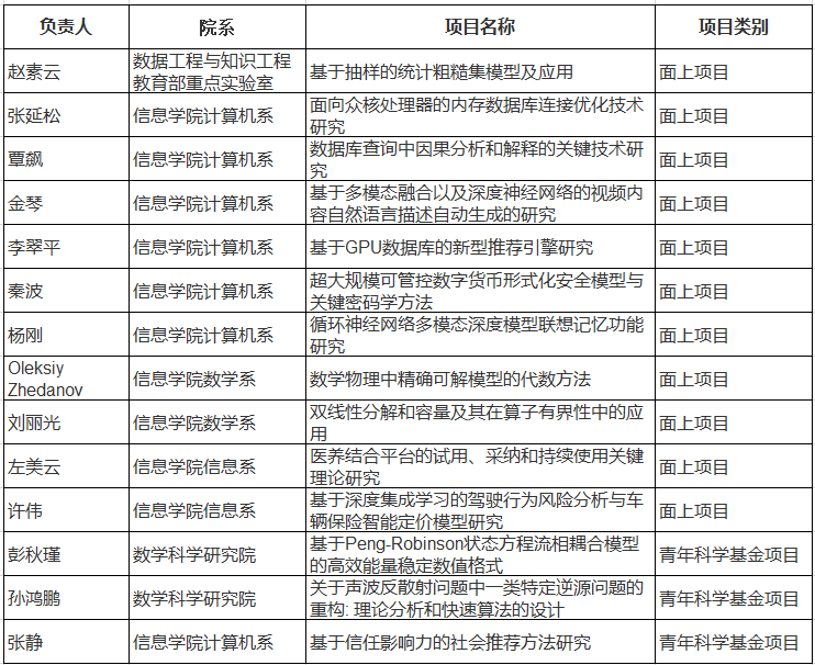 在已经公布结果的项目中,威尼斯官网获得面上项目11项,青年科学基金项目3项。其中,计算机系7项,信息系2项,数学系2项,数学科学研究院2项,数据工程与知识工程重点实验室1项。