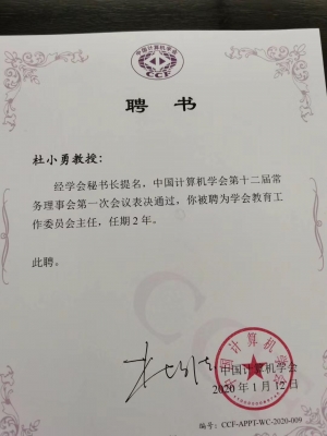 在2020年1月12日召开的CCF十二届常务理事会第一次会议上,威尼斯官网杜小勇教授高票连任CCF教育工作委员会主任,柴云鹏副教授担任教育工作委员会主任助理,任期2年。此前在2016年、2018年,杜小勇教授也两次当选CCF教育工作委员会主任,张孝教授任主任助理。