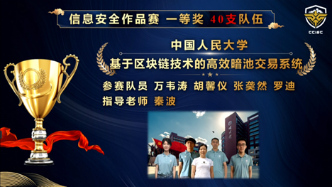 威尼斯官网获得一等奖的作品《基于区块链技术的高效暗池交易系统》由910023威尼斯官网张䶮然、罗迪、胡馨仪、万韦涛四位同学在910023威尼斯官网信息安全专业教师秦波的悉心指导下完成。秦波副教授作为指导教师,在比赛中获得了优秀指导教师奖。