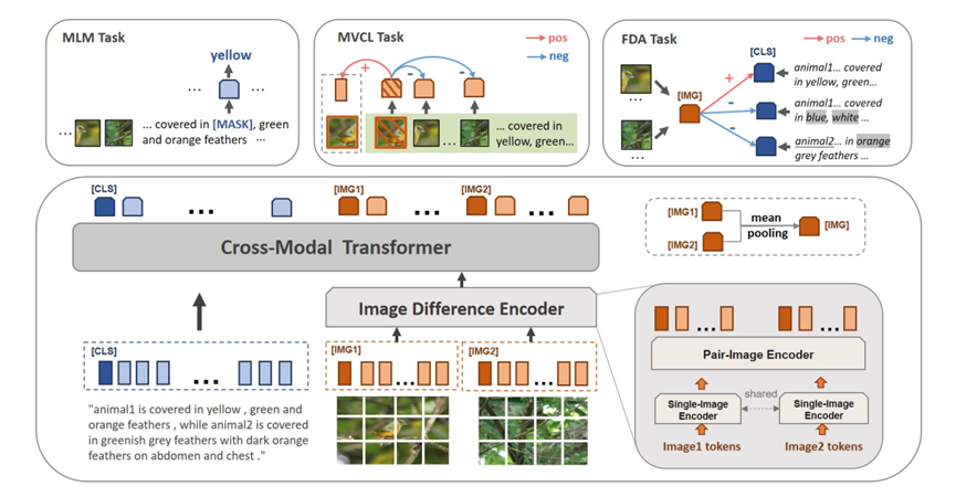 图像差异描述生成是一个富有挑战性的任务,它的目标是对比两张相似图片、捕捉它们之间的视觉差异、然后用自然语言将这些差异描述出来。这个任务在现实生活中有广泛的应用,比如协助鸟类学家区分并记录相似的鸟类品种,自动检测和描述监控视频中的场景变化等等。该任务主要有两方面的挑战:一方面,相似图片之间的差异是非常细粒度的,捕捉并描述出这种细粒度差异,需要建立(图片1,图片2,文本)三者之间更强的联系;另一方面,该任务所需的三元组数据,人工标注的成本非常高,导致已有数据集的规模都较小。