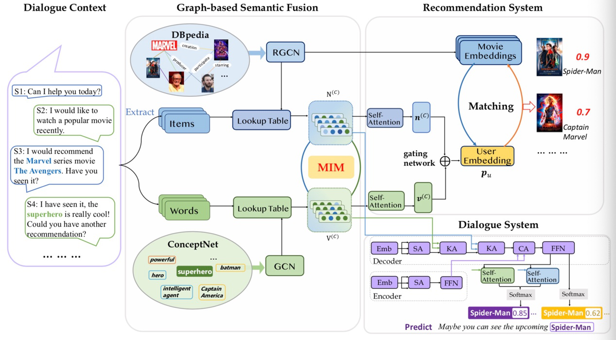为了解决这些问题,我们将面向单词的知识图谱和面向实体的知识图谱结合起来,以分别增强这两种语义单元的表达。此外,我们提出了使用互信息最大化的策略来对齐两个组件的语义空间。在语义对齐的基础上,我们进一步利用了知识图谱强化后的的推荐模块来提供精准的推荐,并利用知识图谱强化后的对话组件来帮助在会话文本中生成信息量丰富的关键字或实体。我们在真实数据集上证明了我们的方法在推荐和会话两个任务的有效性。