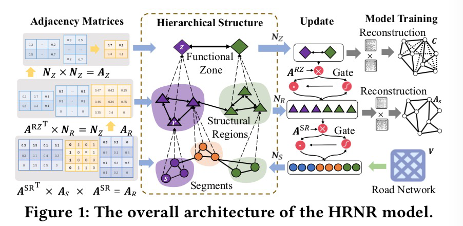论文概述:路网是现代城市交通运输的重要组成部分,广泛应用于和交通有关的各种系统以及应用中。由于其在很多任务中的重要地位,因此开发一个通用、有效并且鲁棒的路网表示模型是一件非常重要的任务。虽然在这个方向已有学者做出了一些努力,然而现有的模型依然不能捕捉到路网复杂的特性。在本文中,我们提出了一个新颖的层次化路网表示模型,名叫HRNR。HRNR通过构建一个多层次的图神经网络模型,分别建模了”功能区域”,“结构区域”以及“路链”。为了建模这三种节点之间的联系,我们引入了两个概率分配矩阵,分别建模了路链到结构区域的映射,以及结构区域到功能区域的映射。然后,我们分别基于路网结构以及人类移动特征设计了两个重构任务。在重构任务的帮助下,我们的节点表示可以同时捕获路网的结构和功能信息。最后,我们设计了一个三阶段的层次化更新机制,用来更新整个网络上三个层次的节点的表示。我们在三个真实数据集和四个任务上评测了我们的方案,并验证了其有效性。