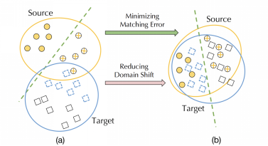 图2 形象的展示了源数据集S(圆点)和目标数据集T(方块),在(a)中由于两个数据集的分布不同,在S上学到的模型M(绿色虚线)无法准确预测T。于是在(b)中,DADER通过调整两个数据集的分布,学习不仅适用于S,还适用于T的模型。