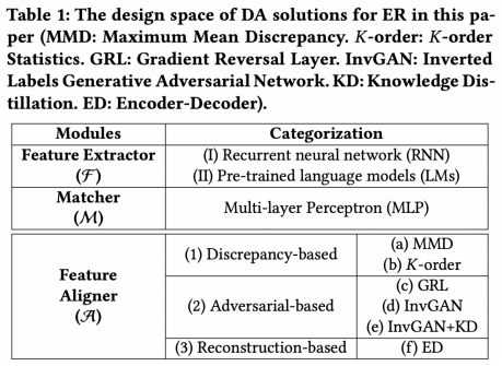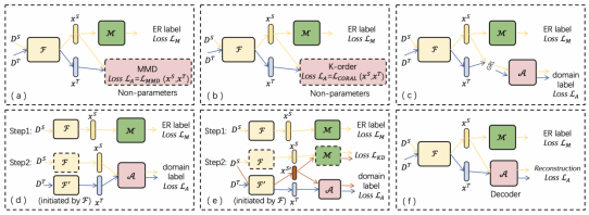 其次,我们定义了以上模型的解决方案设计空间。如表1所示,对于Feature Extractor, 我们主要应用两类高效的深度学习网络:循环神经网络RNN和预训练语言模型LMs。 对于Matcher,我们使用最常用且高效的MLP。对于Feature Aligner,我们设计了三大类主流的域适应技术:Discrepancy-based,Adversarial-based,和Reconstruction-based。Discrepancy-base通过减小两个分布的距离度量指标来减小数据差异,Adversarial-based通过对抗训练的思想使两个数据集的特征融合,Reconstruction-based通过同一个Encoder和Decoder网络提取出两个数据集通用的特征。我们提出了(a)到(f)六种代表性方法来探讨不同域适应技术的性能,图4展示了该六种方法的具体模型结构(都是图3的通用框架的具体实现)。